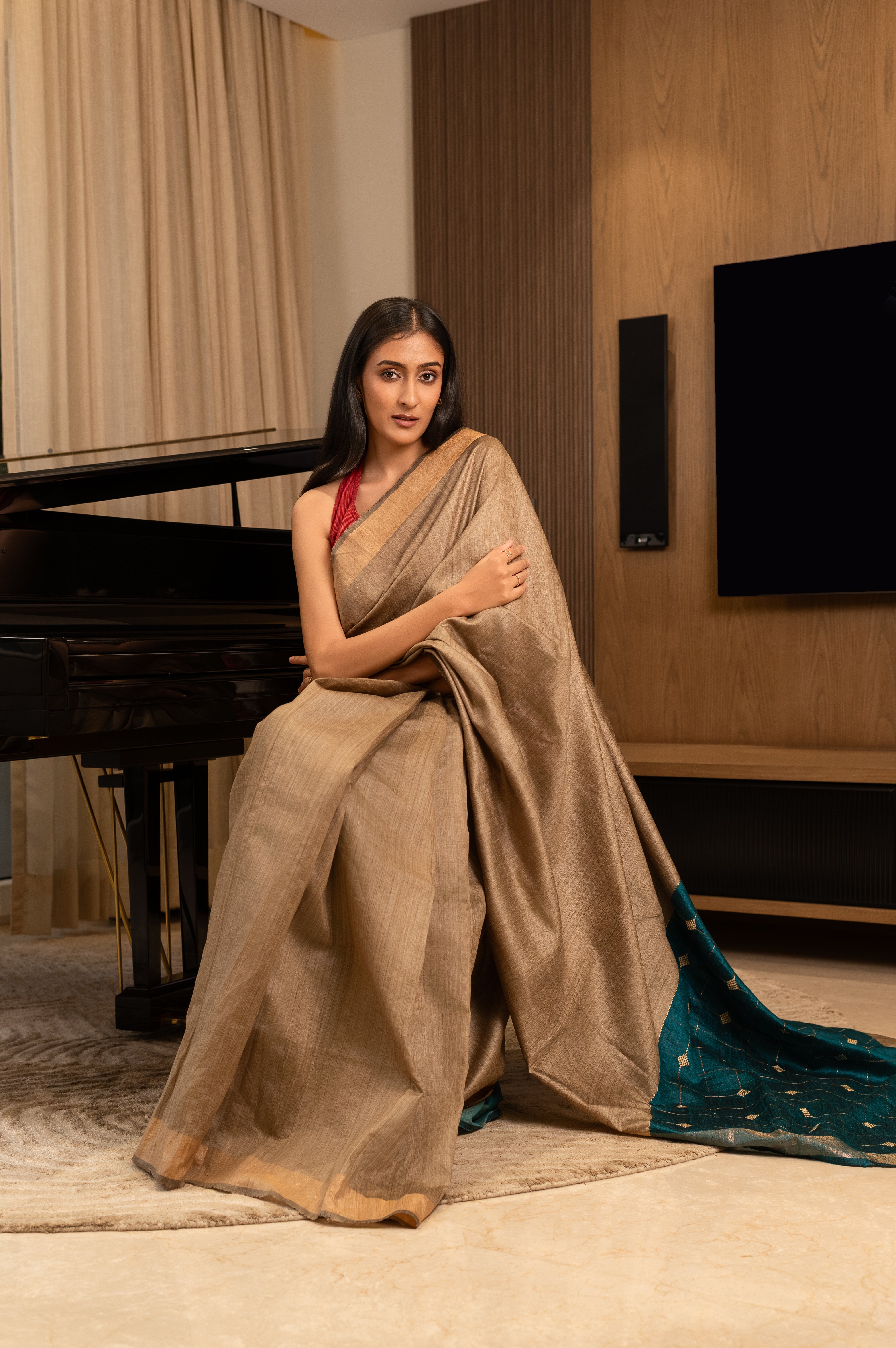 From our festive collection Ganrang, presenting the Black Handwoven Tussar Silk Saree — a masterpiece of elegance and grandeur. Woven from the finest tussar silk, this saree features a deep black hue that exudes sophistication and timeless charm. The natural luster and textured weave of tussar silk elevate its appeal, making it a perfect choice for festive occasions, weddings, and evening gatherings.