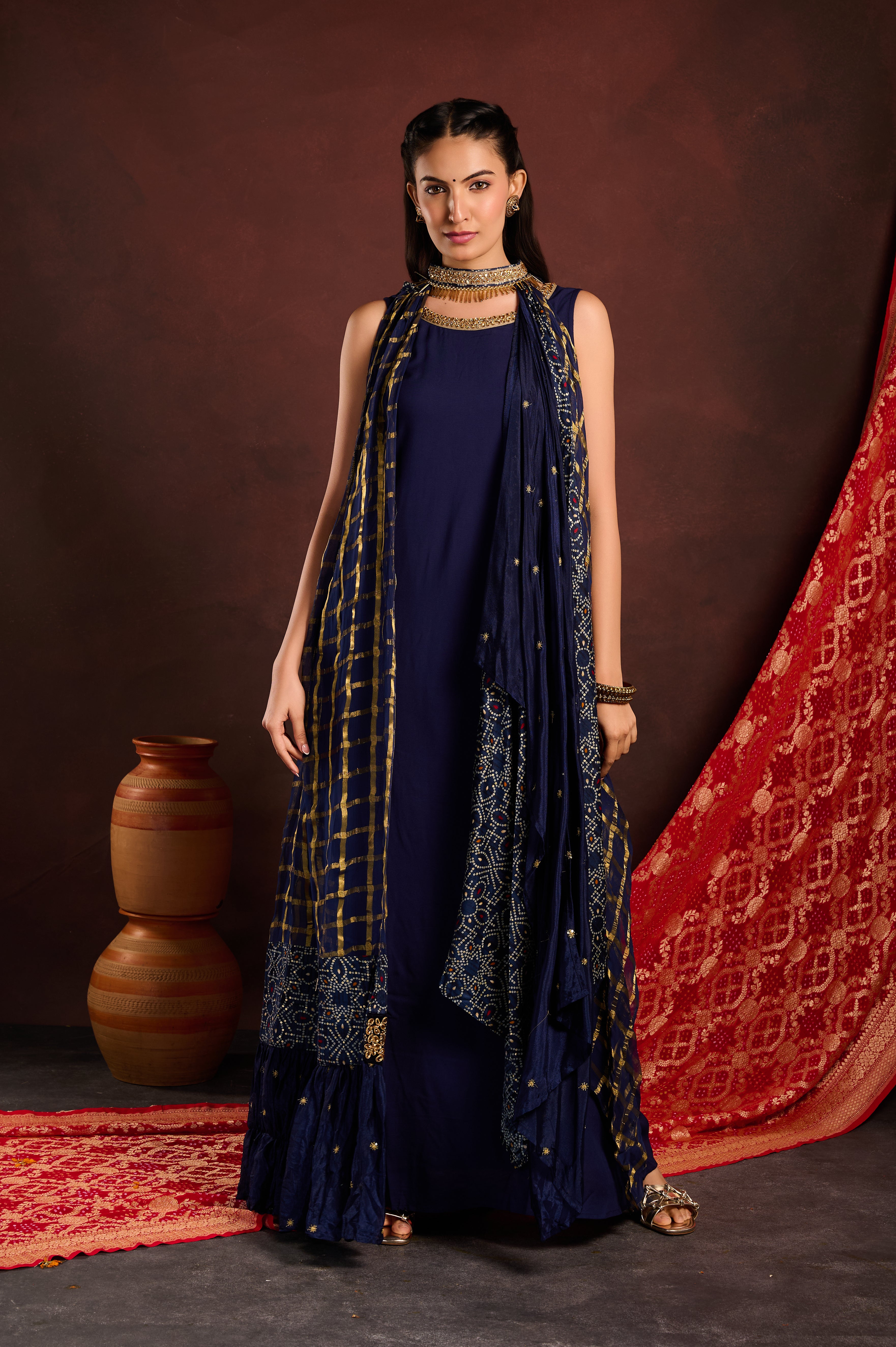 From our NavaRaga festive collection, presenting the Blue Cotton Anarkali Set; a refreshing blend of comfort and festive detailing. The anarkali comes with adjustable straps for a perfect fit, while its flared silhouette is adorned with delicate shell embellishments that add a playful, handcrafted charm. Paired with a vibrant printed dupatta, this set beautifully balances tradition with a light, breezy appeal.