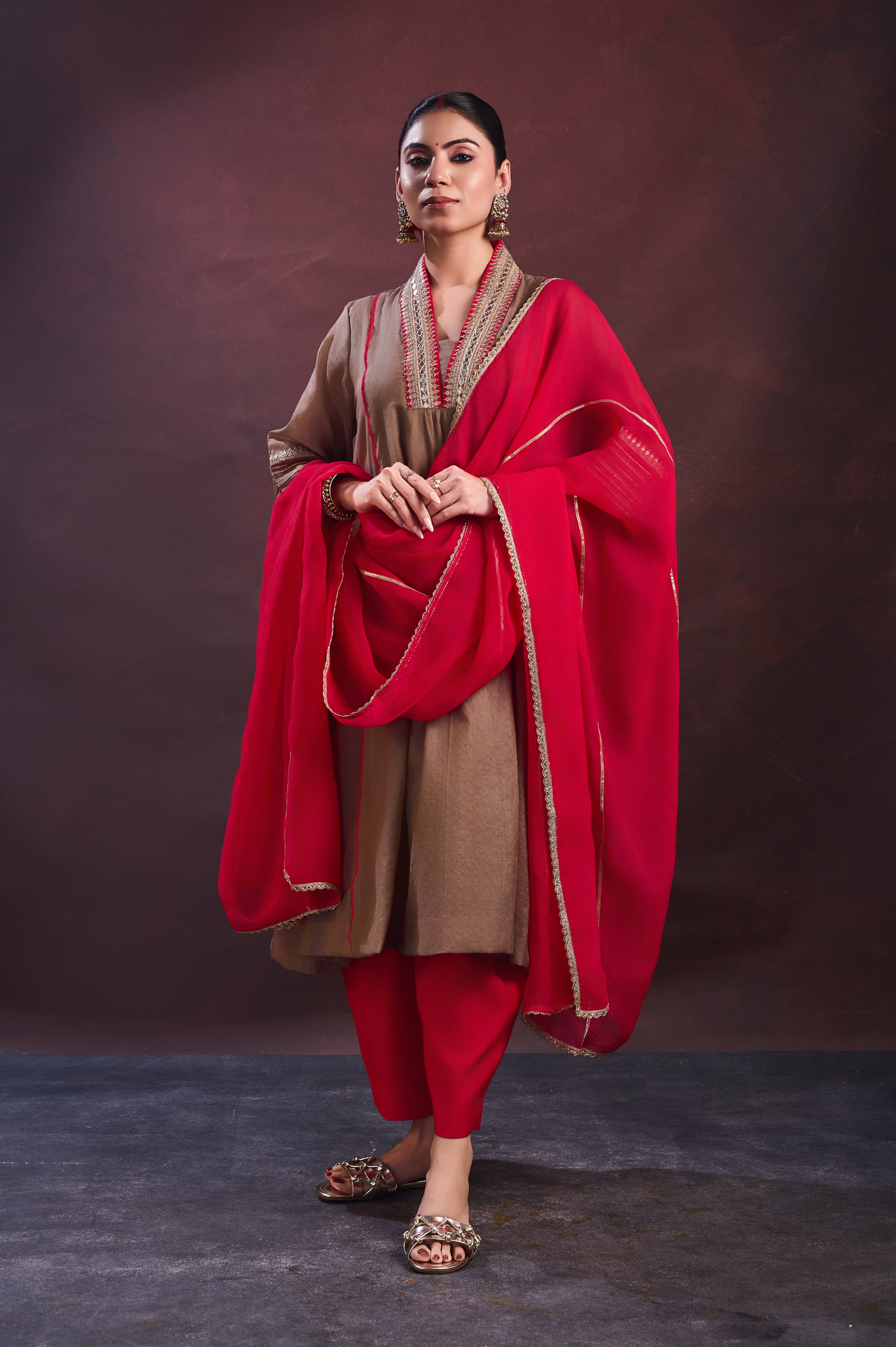 Rose pink Chanderi 3 piece kurta set features delicate zari embroidery with Gota highlights on the neckline, sleeves, and front, adding a festive sparkle.