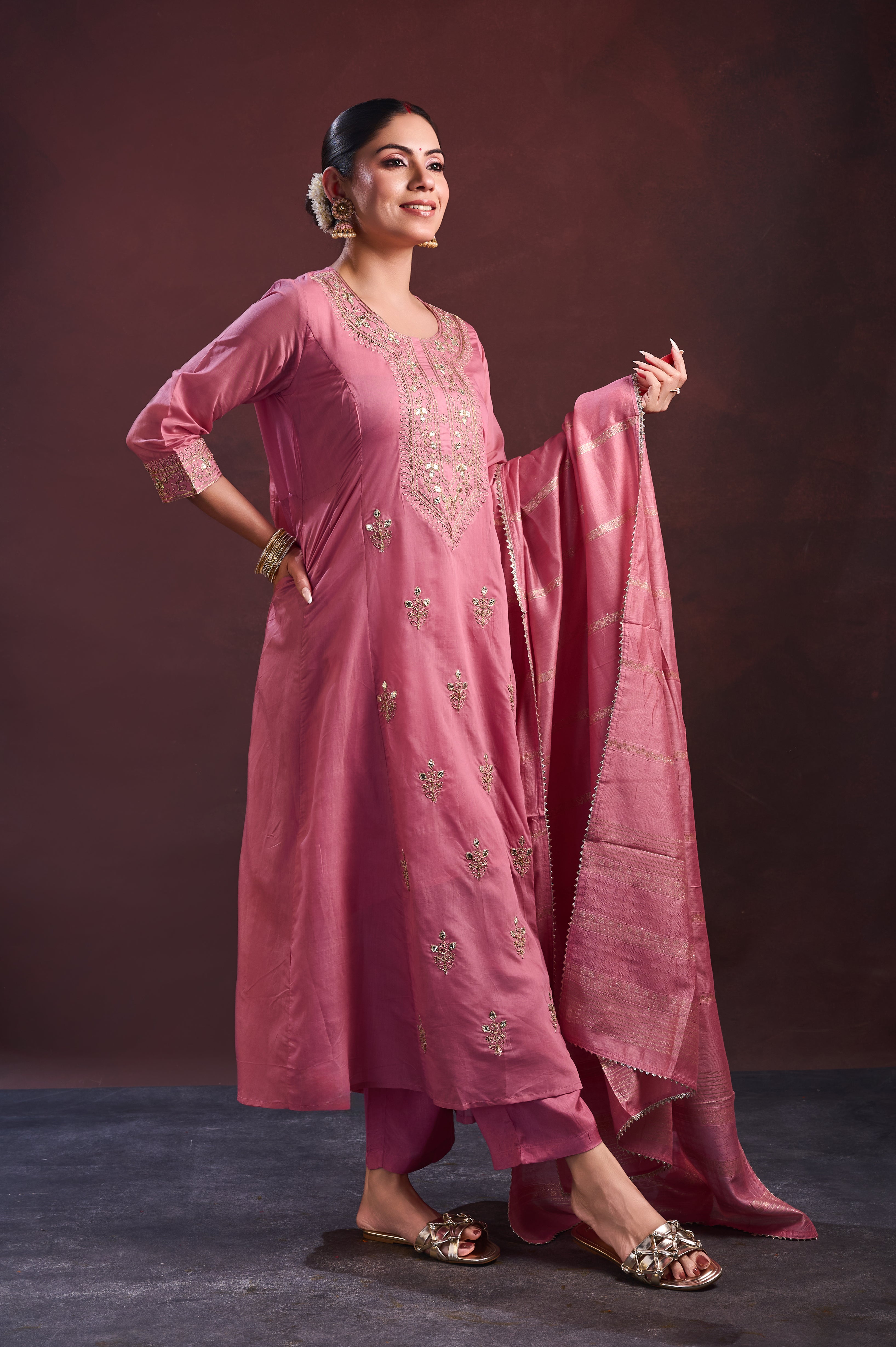 Elevate your festive style with this royal purple kurta set featuring a sweetheart neckline neckline and intricate golden zari-resham embroidery on the yoke, hemline, and sleeves. Paired with embroidered straight pants and a vibrant red dupatta adorned with delicate motifs and scallop border embroidery, this ensemble exudes regal elegance perfect for festivities and grand celebrations.