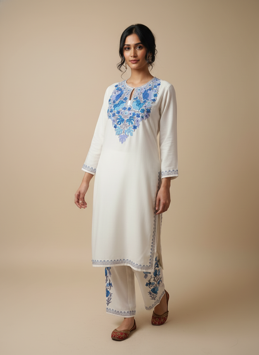 White Aari Embroidered Co-ord Set with Blue Floral Motifs
