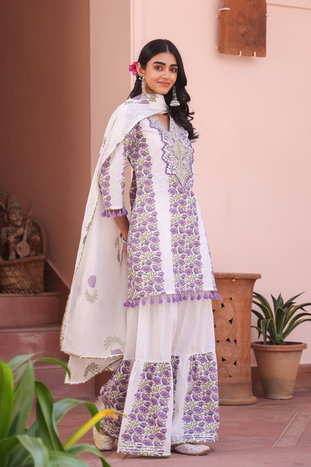 White & Pink Handblock Cotton Suit Set for Women – Printed Kurta with Palazzo & Dupatta
