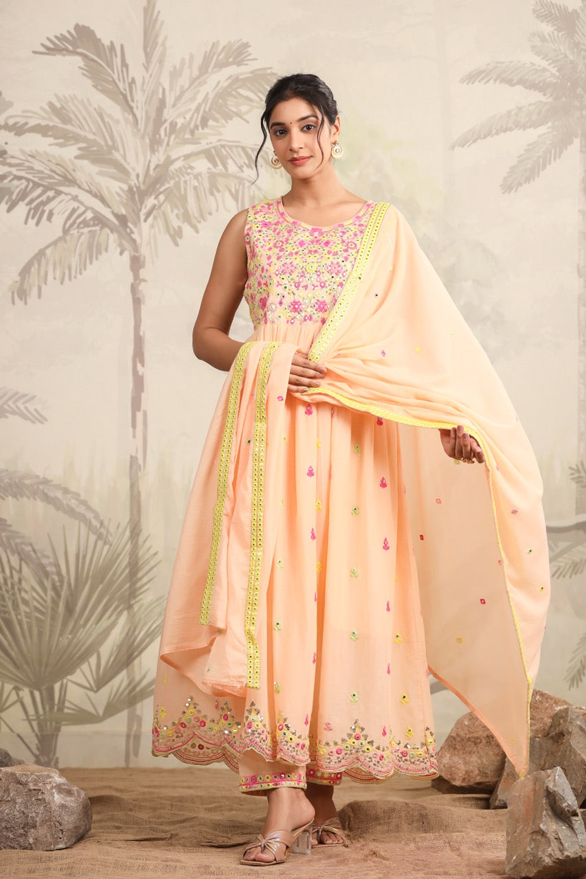 The palazzo pants mirror the kurta’s floral theme, and the dupatta adds sophistication with its delicate chrysanthemum-style flower print, making this outfit ideal for daytime festivities, family functions, or casual ethnic gatherings.