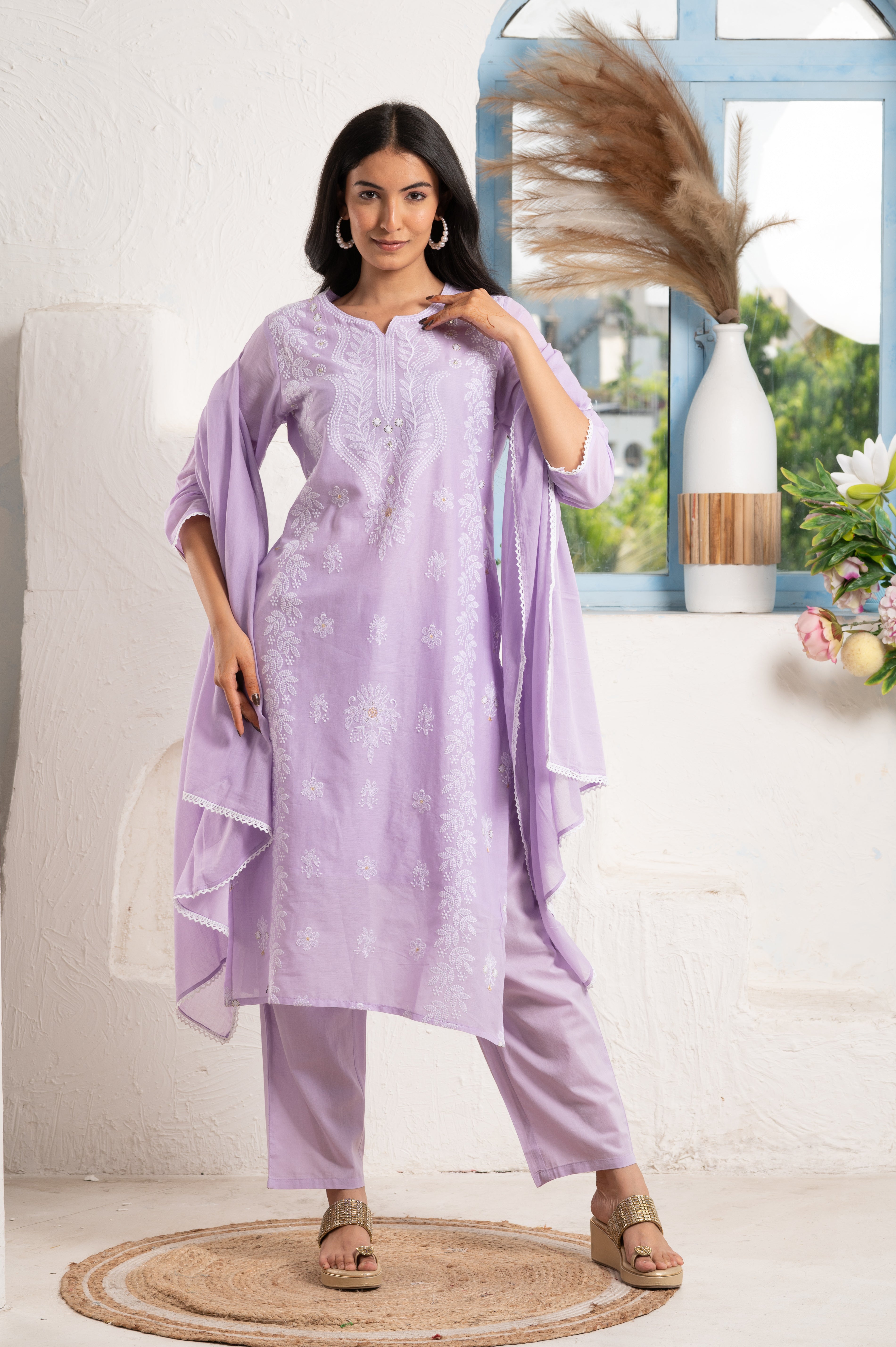 Crafted from a breathable cotton fabric, the kurta features a round split neckline, 3/4th sleeves, and beautiful detailing on the front panel for a festive yet wearable look. The set is completed with solid straight pants and a matching dupatta, giving it a graceful finish perfect for casual celebrations, daytime events, or family gatherings.