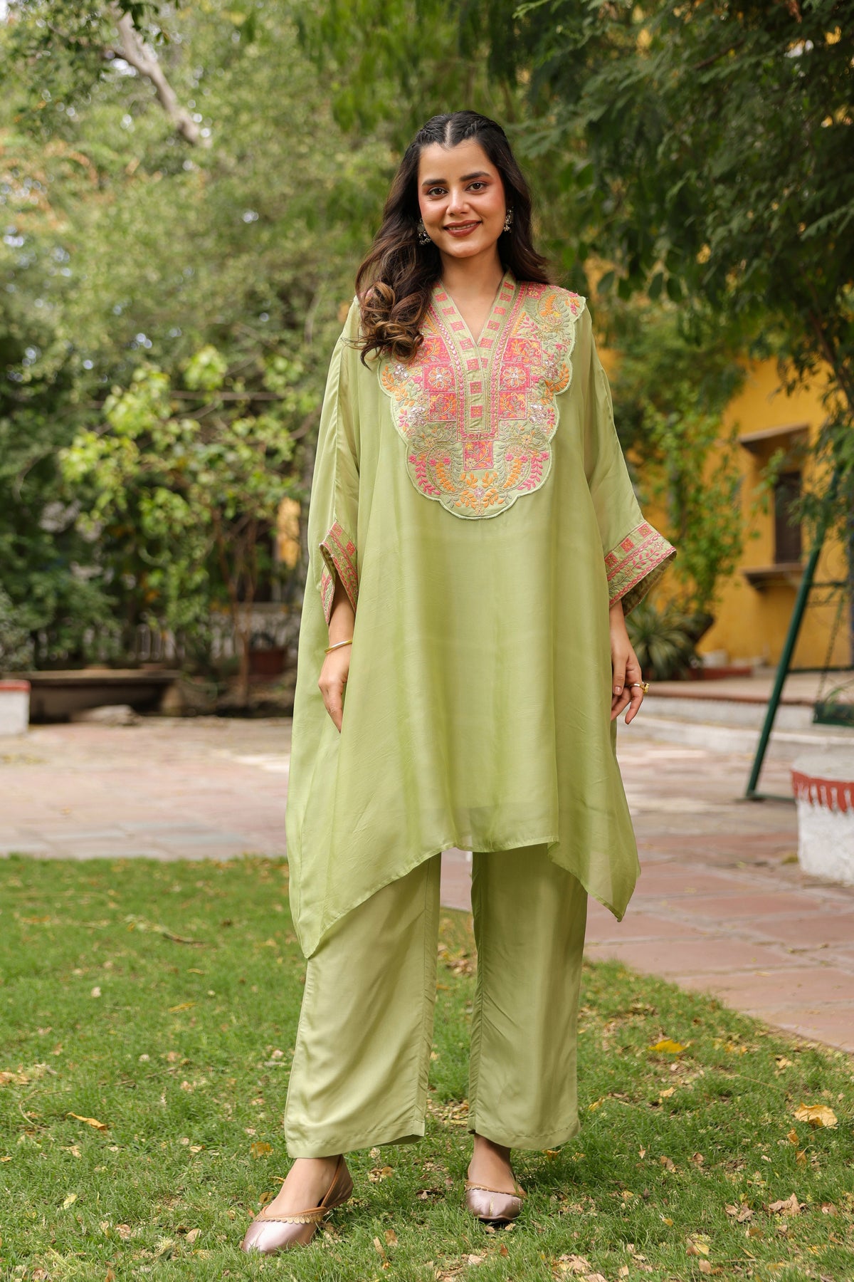Whether you're attending a daytime celebration or a festive gathering, this pastel ethnic set makes for a refreshing and graceful choice.