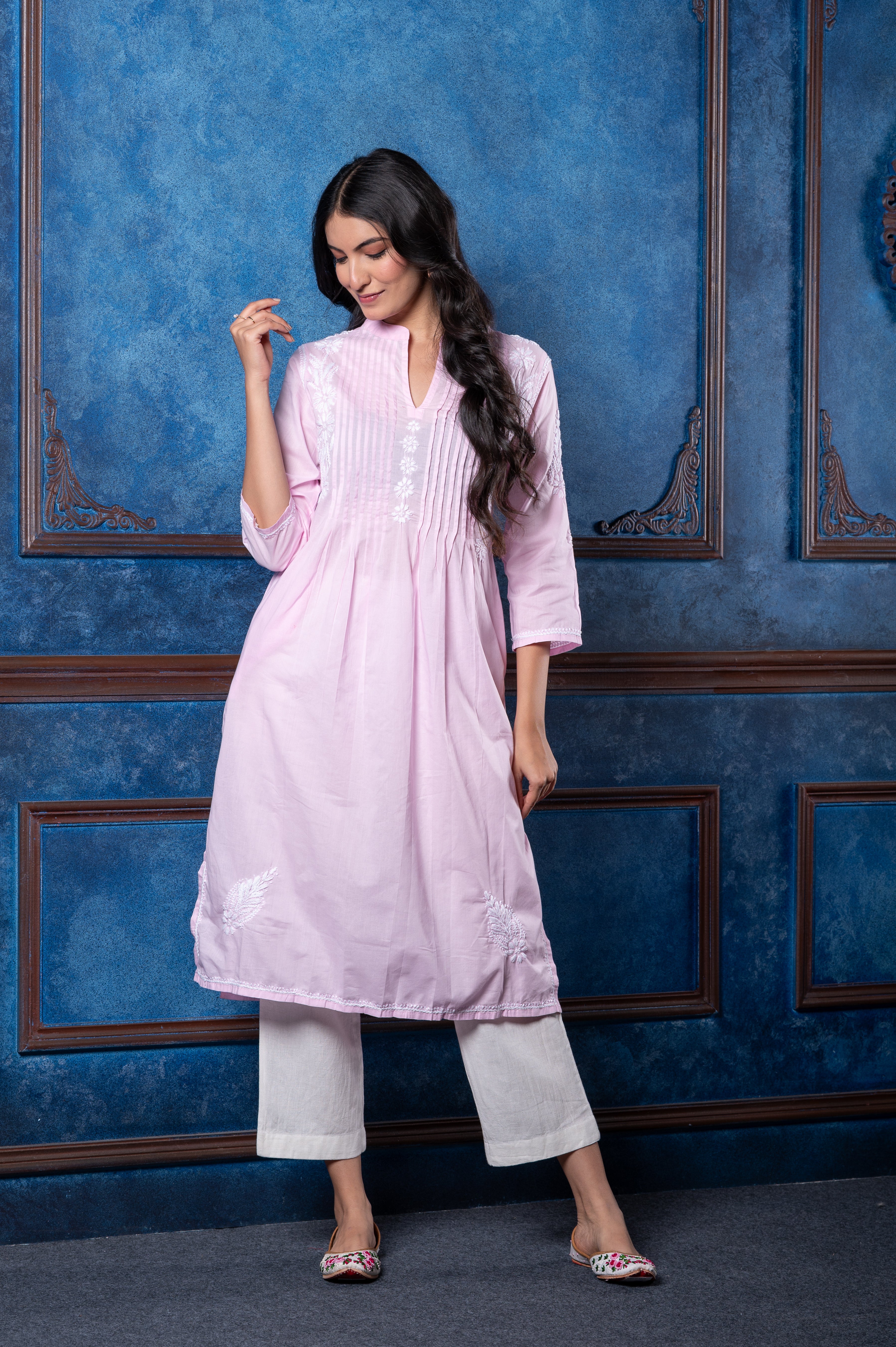 The Brown Cotton Flex Co-ord Set features an angrakha pattern with a round neckline and V-cut, highlighted by intricate handwork. Adorned with floral applique embroidery, three-quarter sleeves, and paired with straight-fit pants, this set exudes effortless elegance.