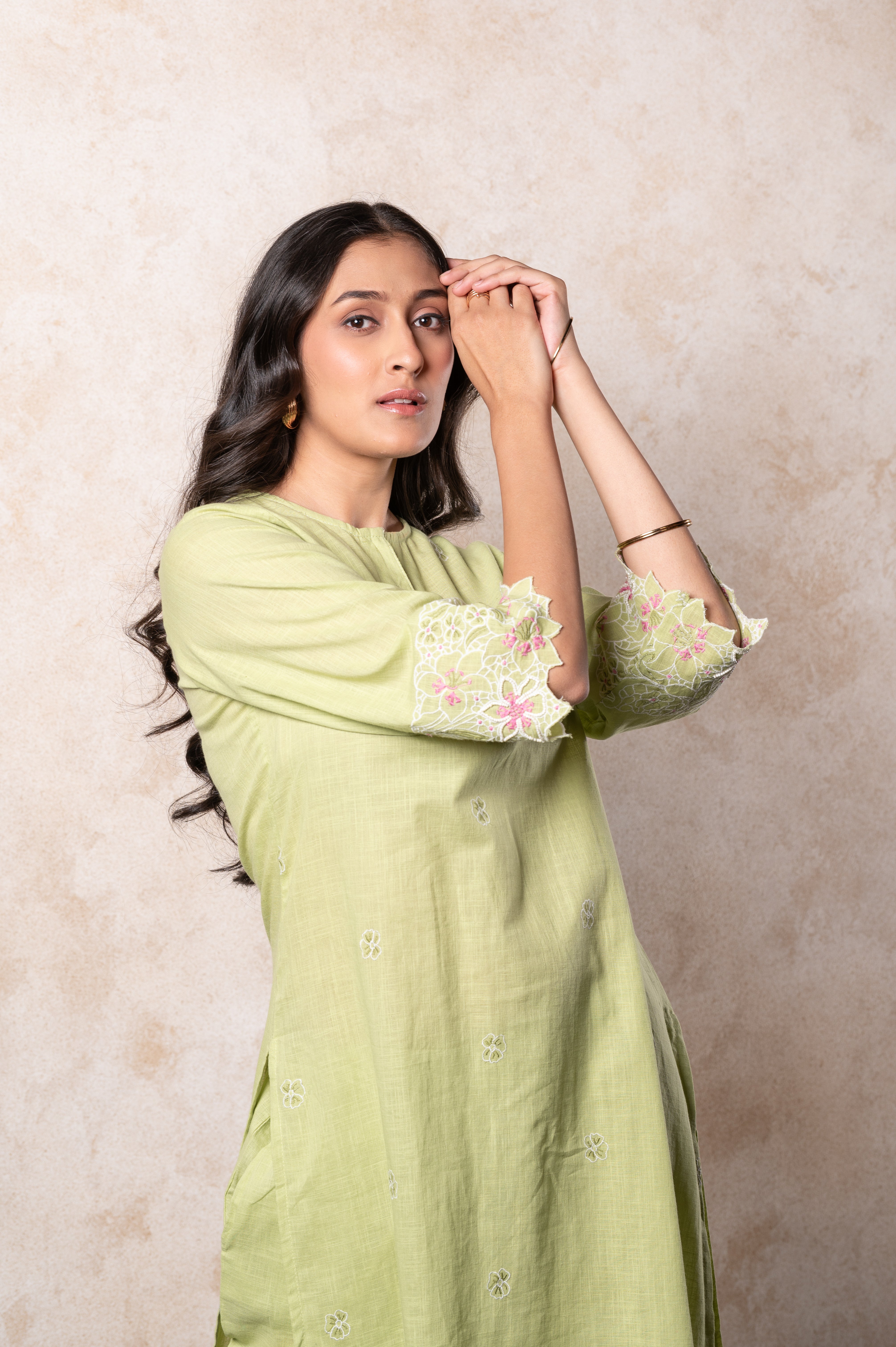 Minimal yet elegant, this pastel green kurta set is a refreshing take on timeless ethnic wear. The long kurta features delicate Chikankari embroidery across the front, sleeves, and neckline, giving it a graceful handcrafted look. The V-neckline with embroidered with lace detailing adds refinement, while the 3/4th sleeves balance the design with a soft, cuff finish.