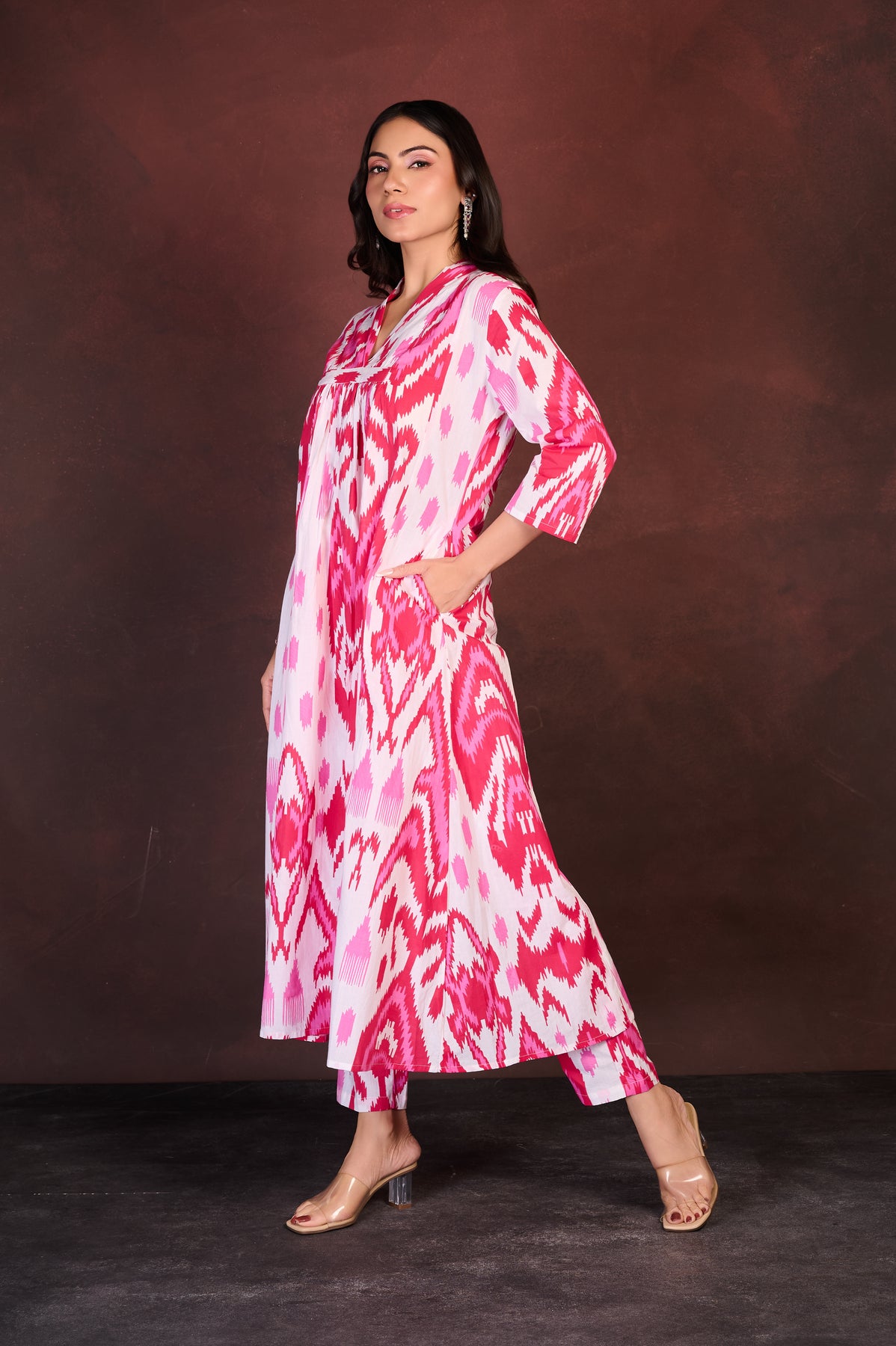 From our NavRaga festive collection, presenting the Pink and White Cotton Printed Kurta Set, a breezy two-piece ensemble perfect for light festive dressing. Crafted in soft cotton, the kurta features an all-over white ikat print and a flattering V-neckline that adds to its chic, minimal appeal. Paired with matching pants, this set balances comfort with effortless style.