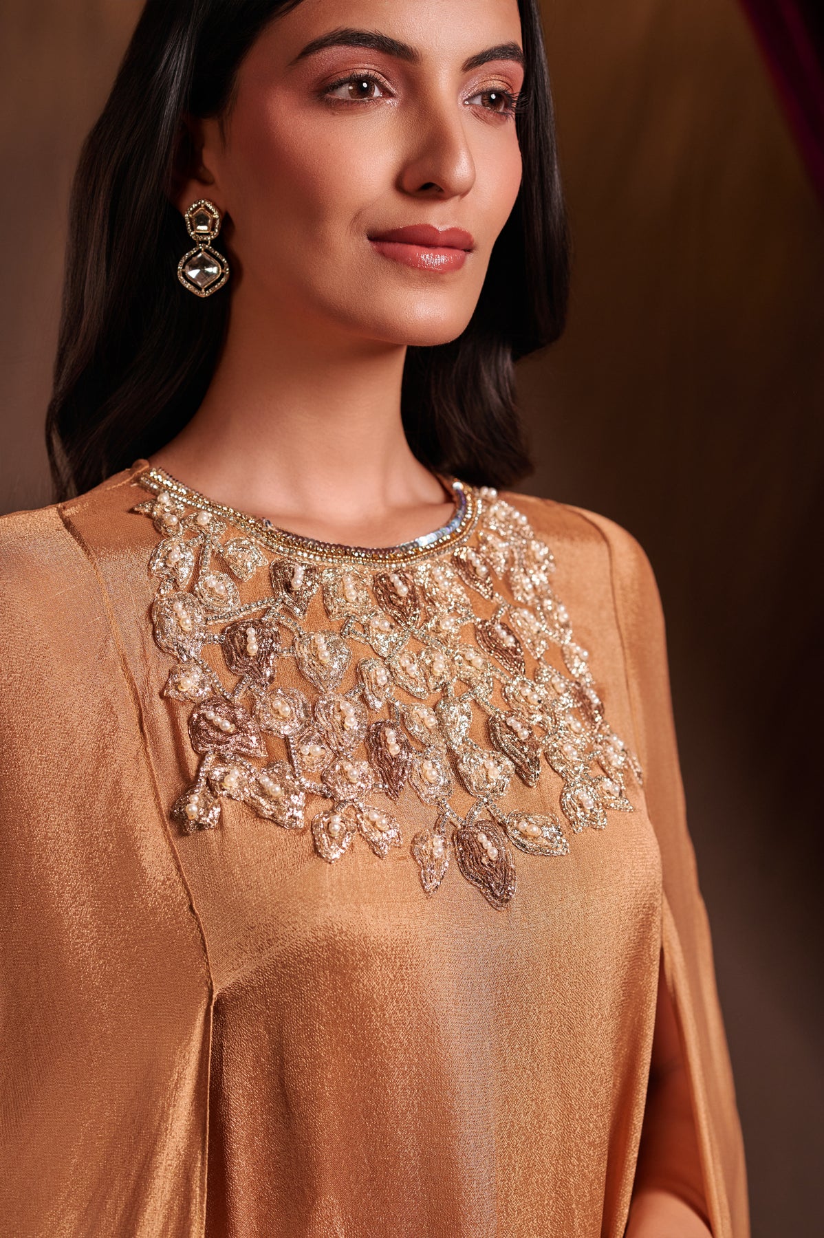 Crafted in chinon fabric, it features a long, cape-style kurta adorned with intricate pear and zari embroidery around the neckline, paired with straight-cut pants that enhance its contemporary appeal. Perfect for evening gatherings, formal celebrations, or festive occasions, this ensemble balances simplicity and luxury with effortless poise.