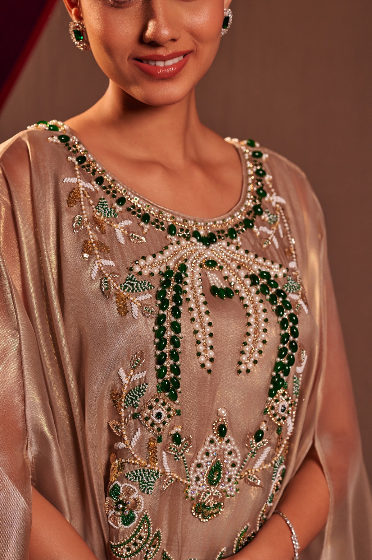 An ethereal brown cape gown crafted in sheer organza, featuring intricate crystal, stone, pearl, and emerald-toned embroidery across the neckline and bodice. The fluid silhouette exude celestial elegance, making it a perfect choice for modern brides or evening celebrations that call for understated opulence.