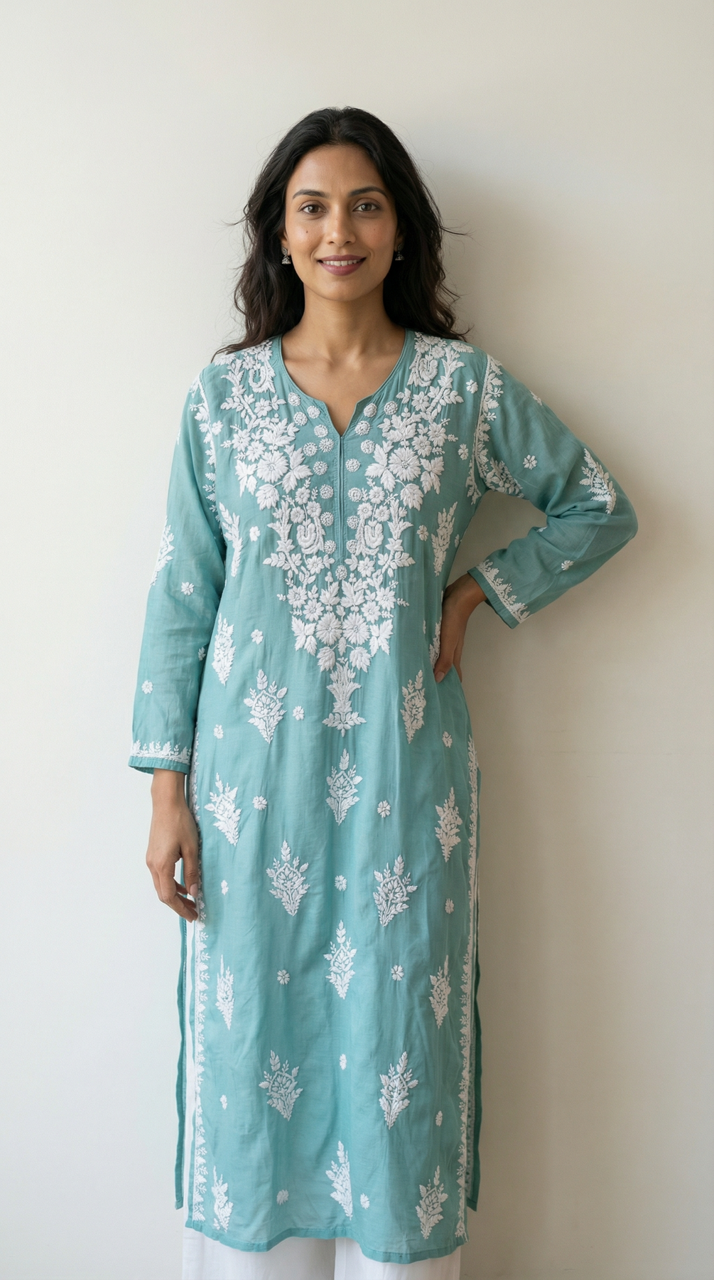 This teal kurti stands out subtly with intricate embroidery.