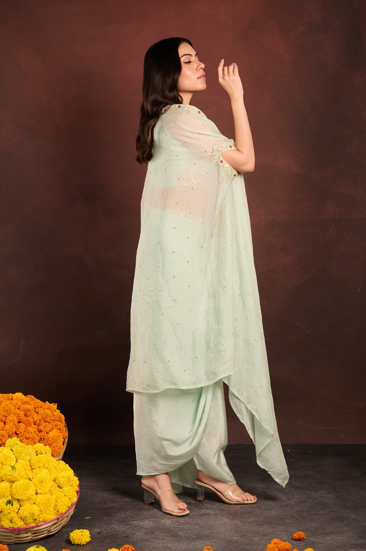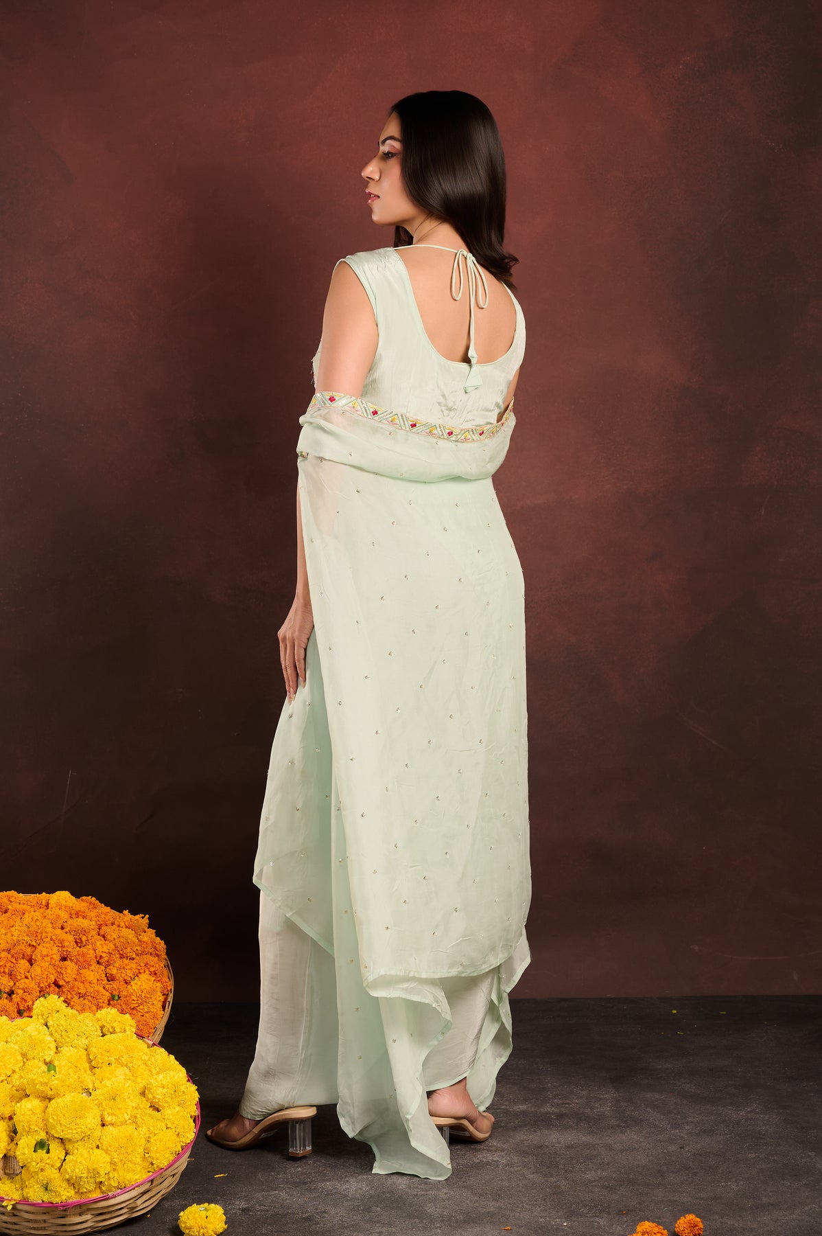 Drape yourself in festive elegance with this stunning mint green ensemble that beautifully blends tradition with modern charm. The intricately embroidered blouse, adorned with threadwork, pre-stitched drape skirt offers effortless sophistication and ease of movement. Paired with a matching embellished jacket, this look is perfect for Diwali soirées or any grand occasion.