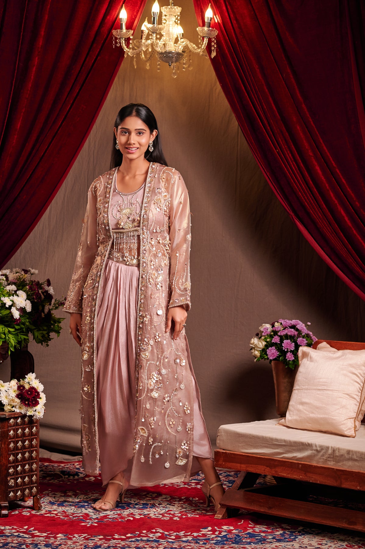 This elegant ensemble blends timeless grace with modern charm. Crafted in chinon and sheer organza, it features a delicately embroidered long jacket adorned with gold sequins, beads, and floral motifs over a matching crop blouse and draped skirt, perfect for pre-wedding celebrations or evening festivities.
